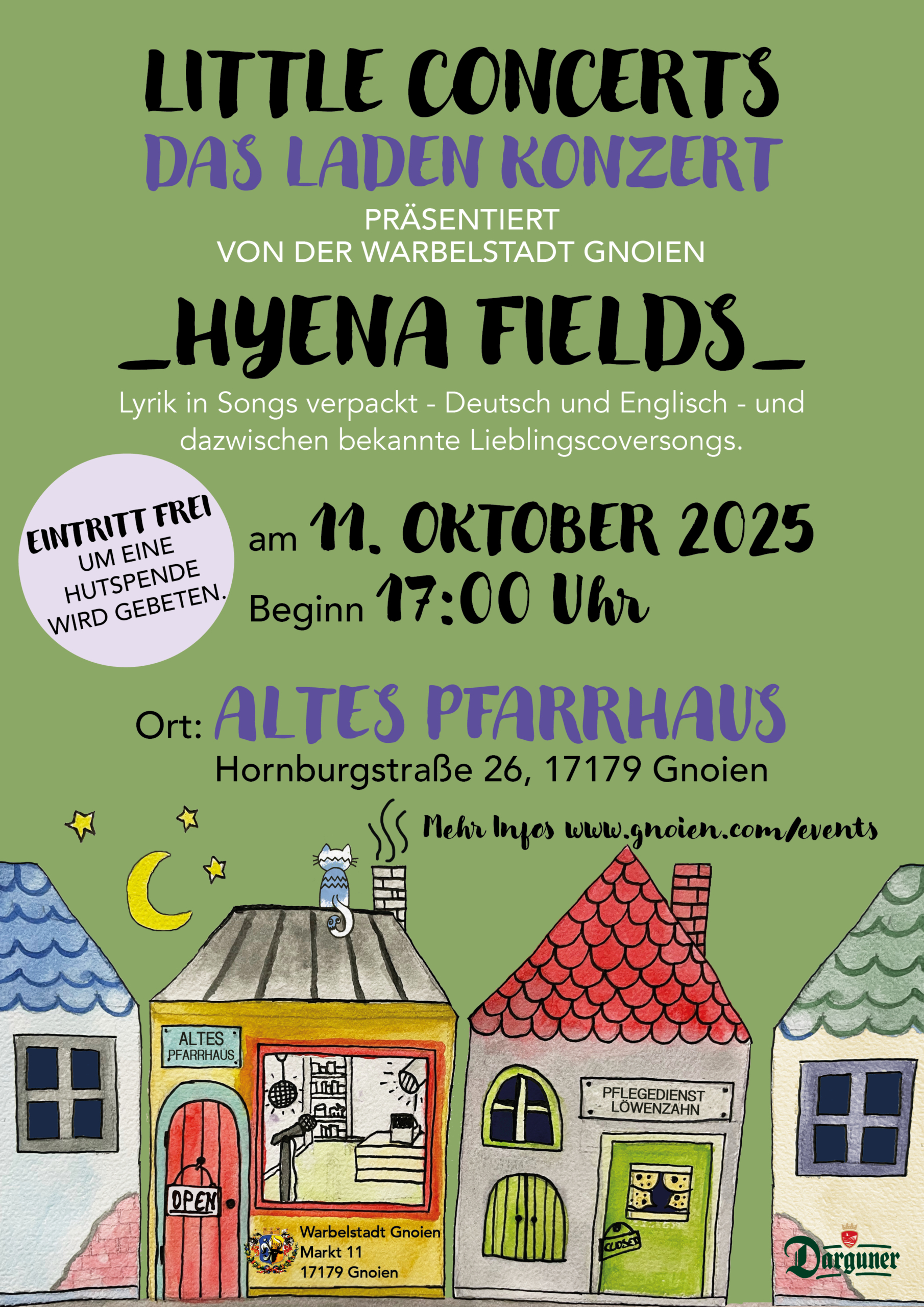 Am 11.10. 2025 ist es wieder soweit, unser erstes Konzert im Oktober findet im Alten Pfarrhaus mit Hyena Fields aus Rostock statt.