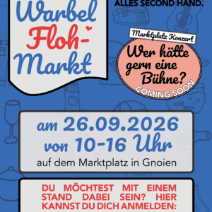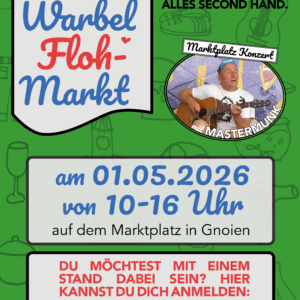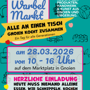 Herzliche Einladung zum gemeinsamen Kochen Am Samstag, den 28.03.2026 muss niemand alleine essen. Beim Warbel Markt im Frühling schnippeln, kochen und genießen wir gemeinsam auf dem Marktplatz in Gnoien. Zusammen mit den Gnoiener Vereinen, regionalen Händler und Künstler entsteht ein ganz besonderer Markttag. Freut euch auf ein buntes Programm mit: Live-Musik einer Radio-Sendung, die ihr […] ...