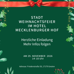 Herzliche Einladung zur Gnoiener Stadtweihnachtsfeier im Hotel Mecklenburger Hof am 29.11.2026 von 14 bis 18 Uhr. Mehr Infos folgen. ...